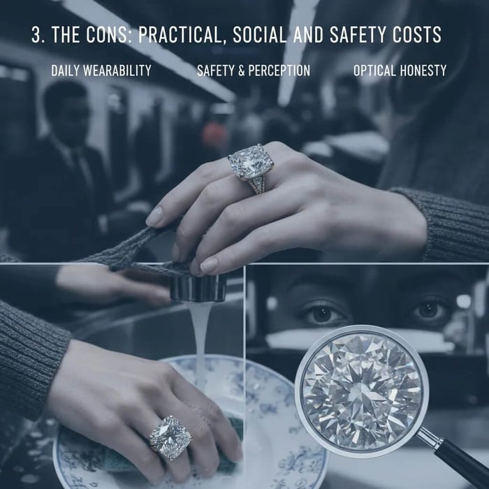 There’s also the part nobody wants to say out loud: a very large diamond ring can make you a target. It’s harder to “dress down” a 5-carat rock when you’re on the bus, travelling, or walking home at night. Even if you’re careful, the visibility alone can invite the wrong kind of attention.