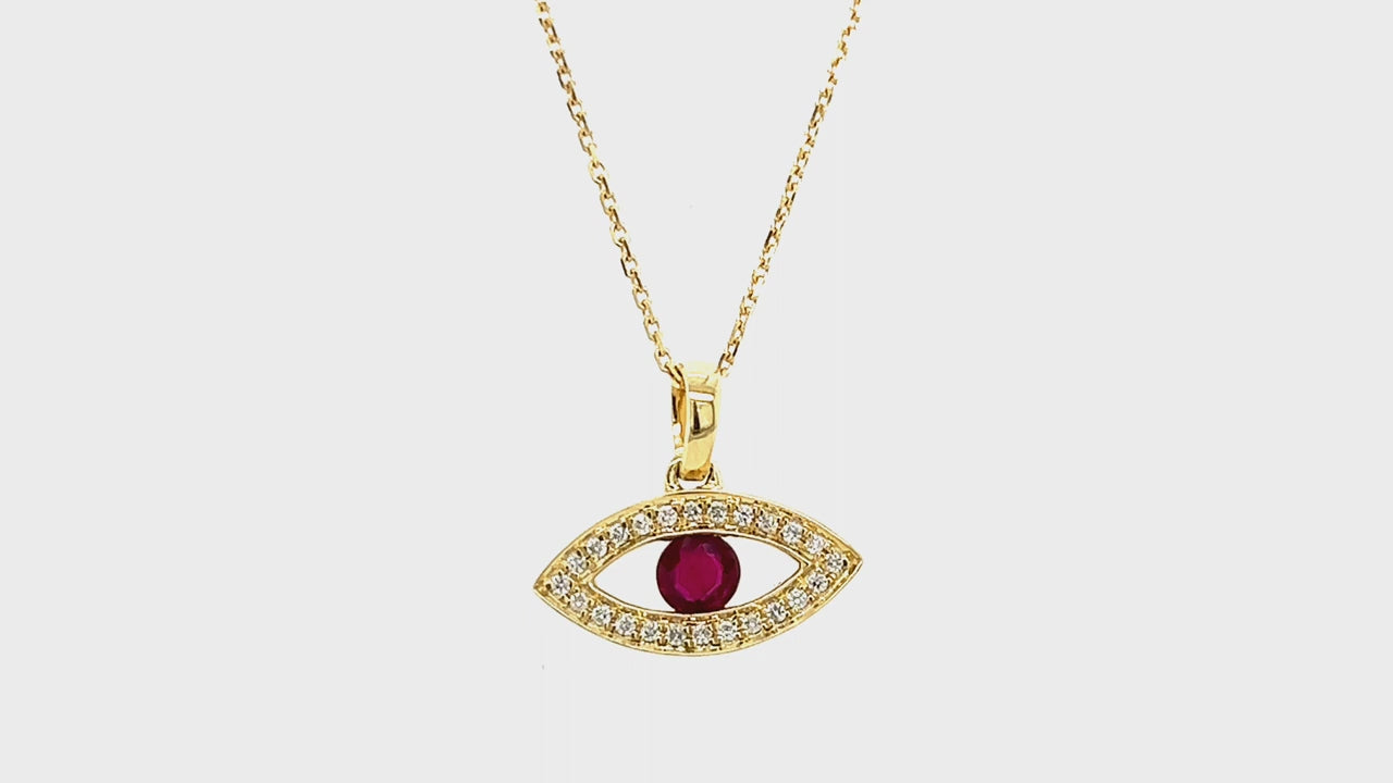 This stunning pendant features a unique 'Evil Eye' Hamsa design, crafted in 9k yellow gold. It showcases 0.19 carats of G/SI quality diamonds and a 0.06 carat red ruby that form the shape of an eye. The pendant comes with a matching 9k yellow gold chain. This pendant is UK designed and handcrafted, making it a truly one-of-a-kind piece. The Hamsa symbol is often worn as a protective amulet. This pendant combines the symbol with the added elegance of diamonds and ruby.