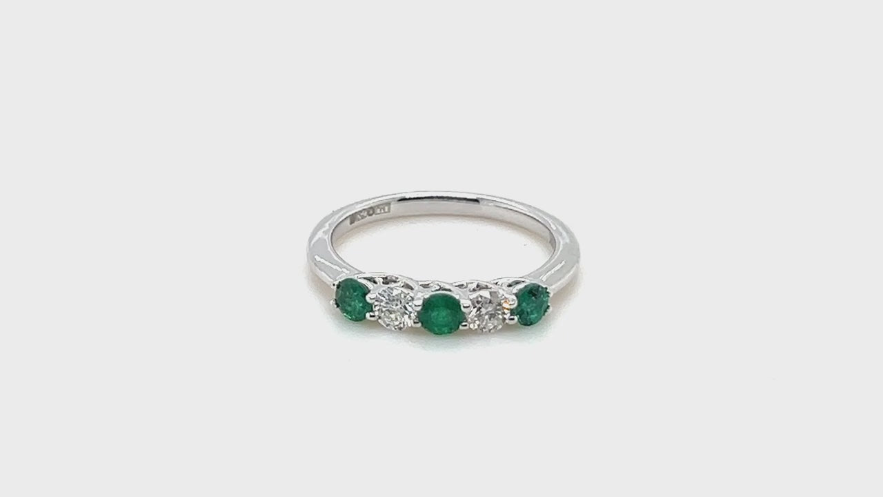 Our dazzling and gorgeous five stone ring is a unique piece and perfect gift for the special someone in your life. Handcrafted and hallmarked in the United Kingdom, this ring features 18k white gold and set with 0.30ct of green emeralds and 0.20ct of diamonds held securely in a claw setting. This ring is a timeless style that's sure to grace your fashion sense.