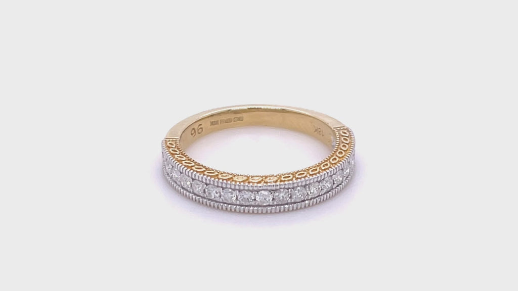 This classic half eternity ring demonstrates the tremendous skills of our UK craftsmen to full effect. Lustrous 18k yellow gold brings its shine and supports eighteen sparkling hand-cut stones of ethically sourced diamonds in the most eye-catching way. This ring is a gift that is sure to take your loved one’s breath away and make her smile for years and years.
