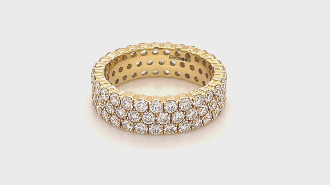This is a sophisticated and elegant three-row full eternity ring, with eighty-seven prong-set round G/SI quality diamonds weighing 3.00ct. The diamonds are set in an 18k yellow gold band in a distinctive 3-row pattern. The ring features ethically sourced diamonds which are carefully placed in claw settings around the band. It's a classic and yet very modern declaration of love and taste. Sold with the confident lifetime guarantee of the work of our UK craftsmen.