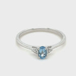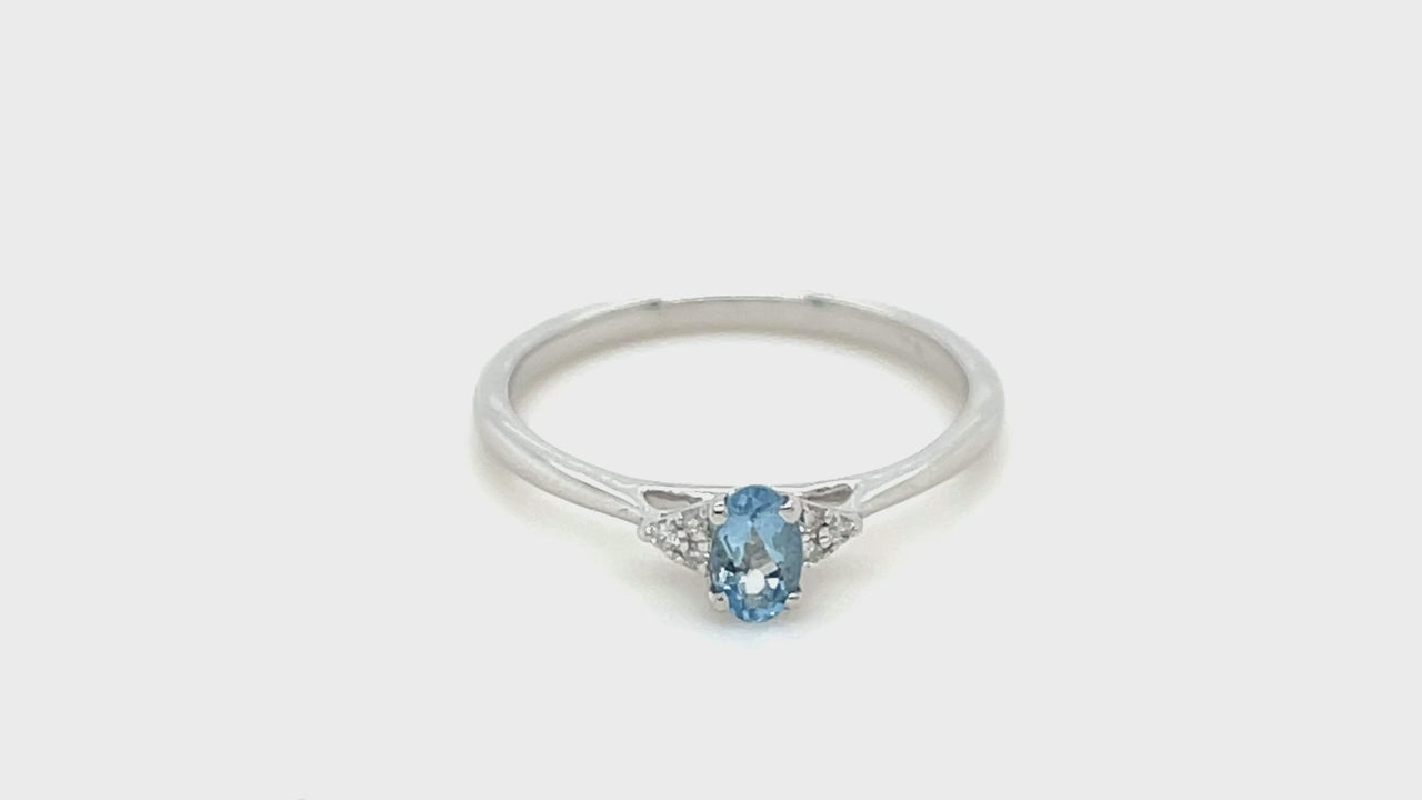 This ring with its central aquamarine and diamond clusters will be a timeless addition to your jewellery collection. The oval aquamarine is enhanced with diamond clusters on either side. The genuine aquamarine is 0.25 carats in weight, while the diamond clusters are 0.03 carats in total weight and are fashioned with G/SI quality diamonds. The jewels are set in a gleaming white gold band that is 9 karats and is handcrafted in the UK.
