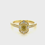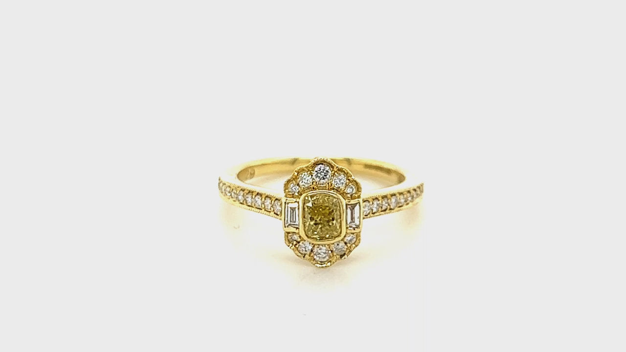 Want to add a little extra sparkle to your ring? Look no further! This art deco cushion cut yellow diamond ring is perfect for any occasion. With a white diamond halo made from round and baguette-shaped gemstones around the cushion cut fancy yellow centre stone, this ring has a combined weight of 0.65 carats. You also get some extra style from the accent stones along the sides of the 18k yellow gold band. Say hello to an old-school piece that's sure to impress!