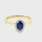 The 9k yellow gold is used to create this gorgeous ring. It makes a wonderful gift for any event. The ring, which has a lovely oval cut blue sapphire weighing 0.60 carats, is a wonderful way to highlight the blue sapphire's beauty. It is the ideal complement to any collection because to its magnificent centre stone and distinctive diamond halo design. The ring has 0.10ct of G/SI quality diamonds. When you wear this lovely ring, you will stand out.