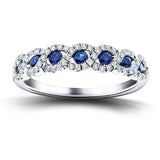 Unique in its design, this beautiful dress cocktail diamond ring is both elegant and classy, and it helps add some sparkle to evening outfits. Fashioned in an immaculate 18k white gold setting, it features round-cut natural blue sapphires with a total weight of 0.30ct. Each of the blue sapphires is encircled with claw set G/SI quality diamonds with a total of 0.25ct. This is a dazzling way to say 'I love you' to her or celebrate with her on a special occasion.