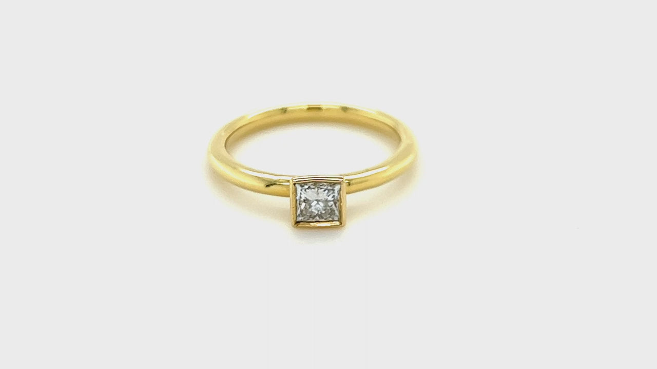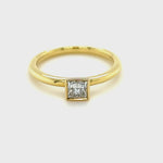 This elegant princess diamond solitaire engagement ring is the perfect way to ask for her hand in marriage. The 0.30-carat princess-cut diamond is set in a beautiful rub-over setting, ensuring that this ring will be cherished for a lifetime. The E/VS quality diamond guarantees that this ring is of the highest quality, while the 18k yellow gold band is hallmarked in the UK. This ring has an independent diamond grading report.