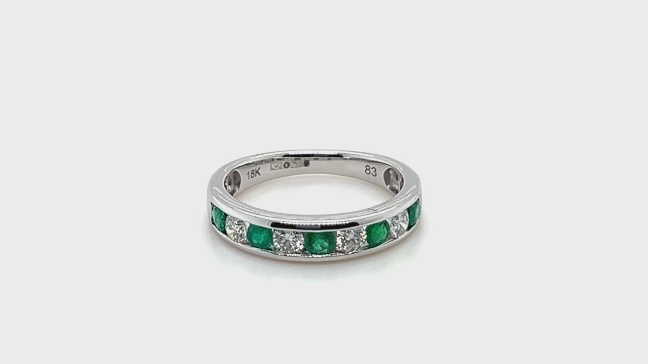 This beautiful half eternity ring is handmade in the UK and proudly sold with a lifetime guarantee of our UK craftsmen's workmanship. A true representation of eternal love, this striking ring is fashioned in 18k white gold and features round 0.30ct of brilliant-cut emeralds and 0.20ct of G/SI graded natural diamonds. All the gemstones are certified to be ethically sourced. This eye-catching, British designed ring will be a perfect gift idea for your lover on any special occasion.