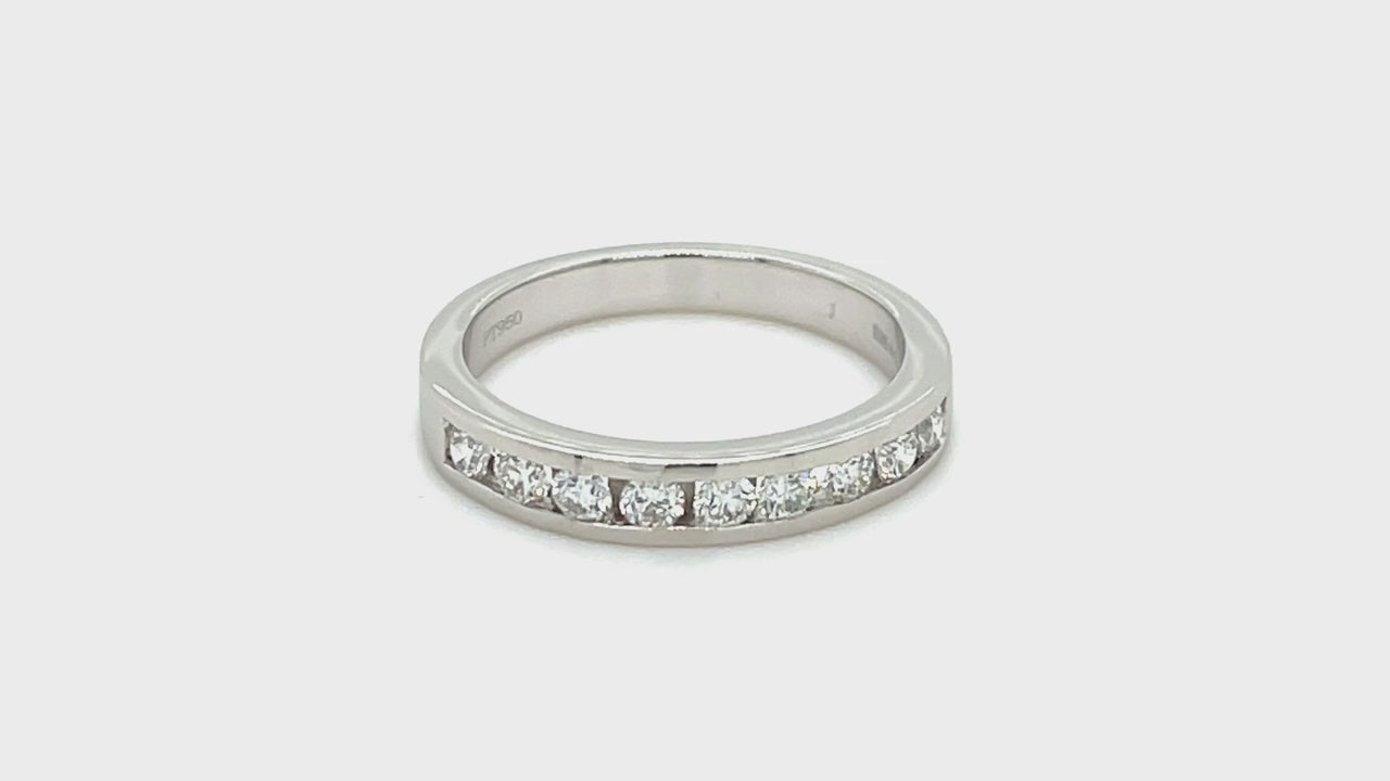 Hand made in 18-carat white gold. This gorgeous half eternity ring is channel set with nine dazzling round brilliant cut, ethically sourced, G/SI quality diamonds. The diamonds weighing 0.50 carats are placed on the fine 3.4mm width fine white gold band. Certain to seal your love on your special day or special occasion.