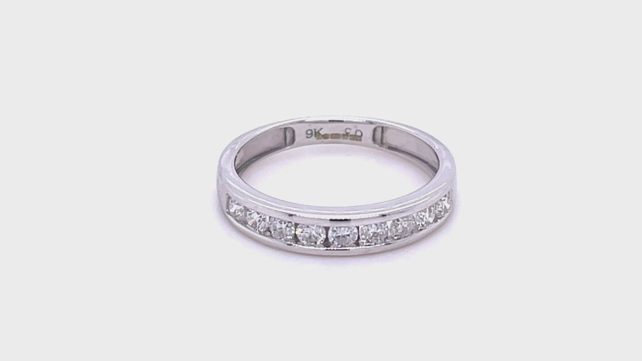 Nine hand-cut stones of ethically sourced G/SI quality diamonds weighing 0.50 carats set gorgeously and firmly in a channel setting against shiny bright 9k white gold to bring light and a twinkle to the hand of your loved one. Guaranteed for a lifetime, bringing elegance and style to any outfits in all places.