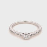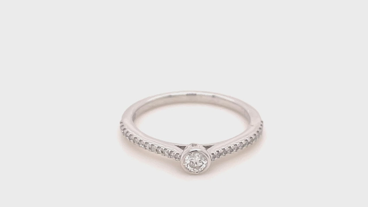 You can never go wrong with the timeless elegance of a beautiful diamond engagement ring that highlights the timeless beauty of a perfectly round diamond. The centre stone is a round diamond in a bezel setting with accent diamonds on the ring's shoulders. The total diamond weight is 0.21 carats. All the ethically sourced diamonds are of G/SI quality. The ring is made of UK hallmarked platinum. This is an elegant engagement ring that will always be noticed!