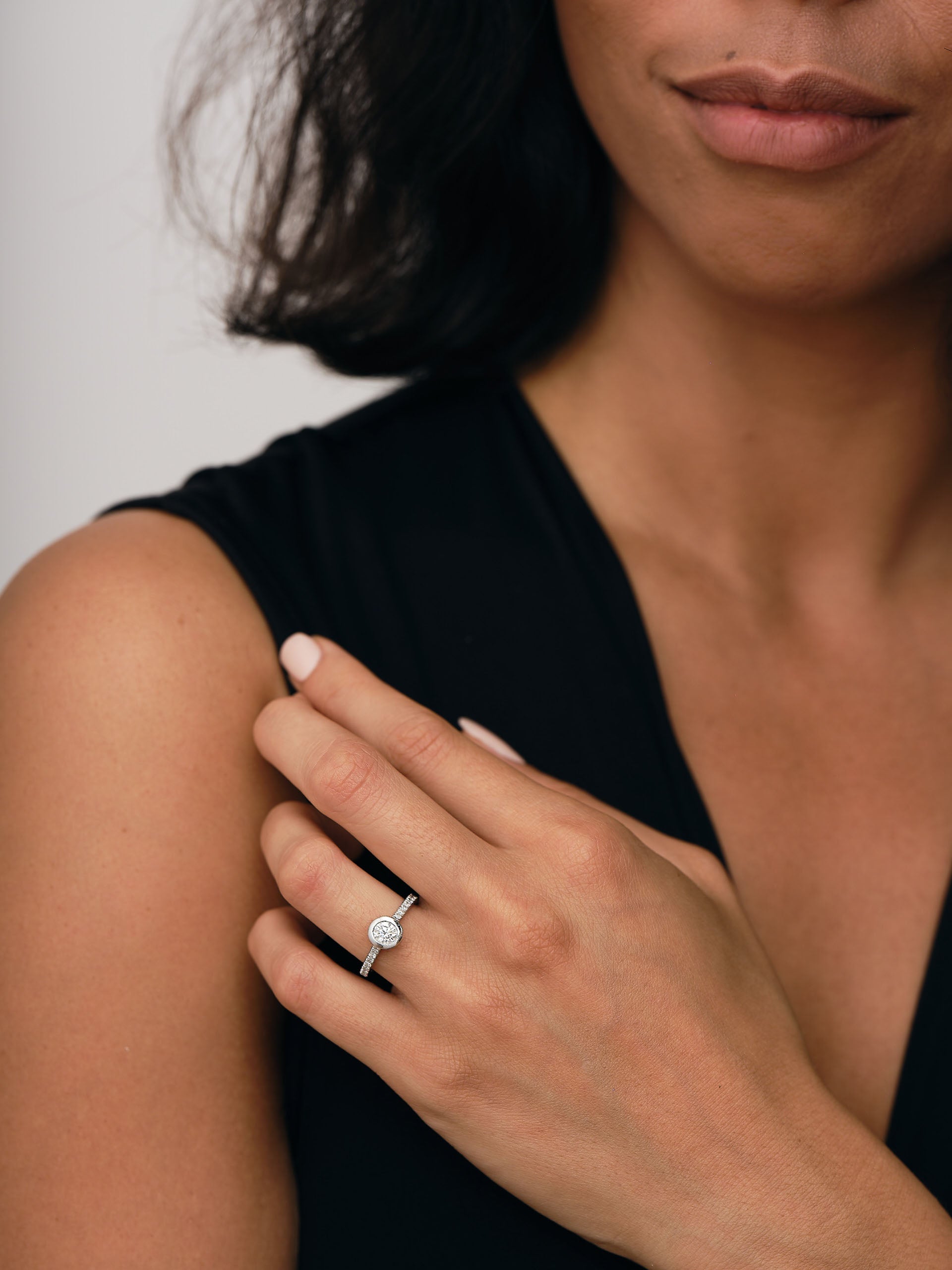 You can't go wrong with the simplicity and elegance of a beautiful diamond engagement ring that showcases the timeless beauty of a round diamond. The centre stone is a round diamond in a bezel setting with accent diamonds on the ring’s shoulders. The total diamond weight is 0.70 carats, and all the diamonds are of G/SI quality. The ring is made of UK hallmarked platinum. This is an elegant engagement ring that will always stand out!