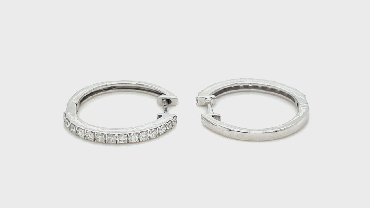 If you're looking for the perfect gift for that special someone in your life, then look no further than these versatile natural diamond hoop earrings in classic 18k white gold. They showcase half a carat of ethically sourced G/SI quality diamonds inlaid in the front of the UK hallmarked 18k white gold hoops in a claw setting. They can be fun or formal; whatever you need your outfit to say, these can help carry it off.