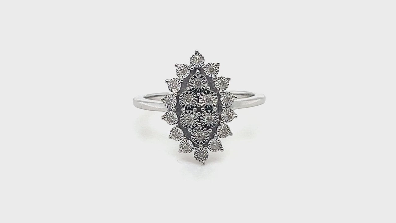 This is a delightful marquise-shaped ring set with 0.20 carats of G/SI quality diamonds in a lovely illusion setting. The setting gives the visual impression of much larger diamonds due to how the setting blends with the diamonds and reflects the gemstone's light. The ring is made from UK hallmarked 9k white gold. This is a ring to choose for anyone who likes to make something of a show! As with all of our jewellery, this ring is offered with our lifetime workmanship guarantee.
