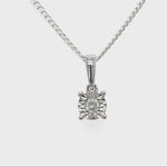 This is an impressive-looking diamond solitaire necklace with a 0.14 carat G/SI quality diamond set in UK hallmarked 9k white gold. The round diamond and setting are designed to make the diamond look much larger than the weight suggests. The pendant is carried on a silver chain that fits perfectly around the wearer’s neck. We offer this British designed and handcrafted pendant necklace with our lifetime workmanship guarantee.