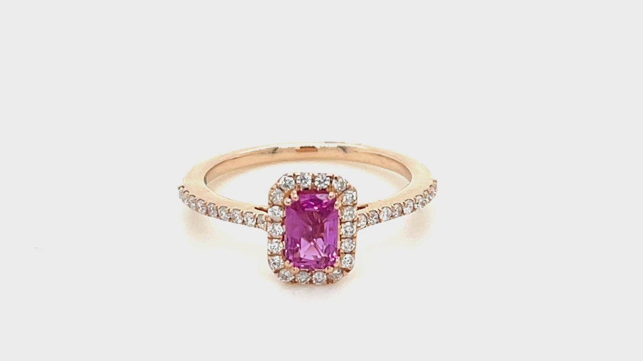 An emerald cut pink sapphire set in 18k rose gold is set in a brilliant and highly reflective diamond halo. The classic shape of the sapphire is a classy, elegant way to wear this lovely sapphire! This exquisite ring features a 0.65CT sapphire and 0.25CT of G/SI graded diamonds. This is a ring to be worn proudly; it will attract positive comments whenever it is worn. We offer this sapphire and diamond ring with our lifetime workmanship guarantee.