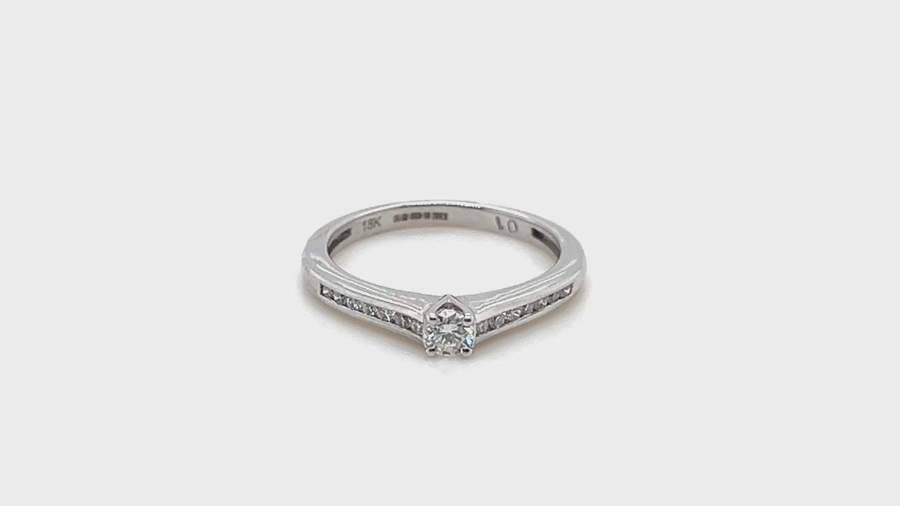 This sumptuous engagement ring with diamond shoulder will make her feel very luxurious and special on the day of your proposal. Beautifully hand-crafted with a total of 0.30ct, G/SI quality diamonds, the setting is made of 18k white gold. This beauty is UK hallmarked and made with conflict-free diamonds.?