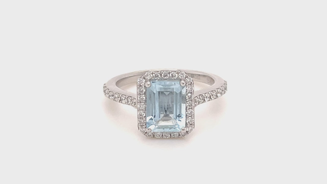 Add a touch of old-fashioned luxury to her finger with this stunningly intricate diamond and aquamarine ring. Crafted to perfection in the UK, the ring showcases a beautifully detailed design and features a central claw set, emerald cut aquamarine weighing 1.31ct. The sky blue gemstone is flanked by 0.38ct of natural G/SI quality diamonds. The 18k white gold band is the perfect backdrop for the beautiful gemstones.