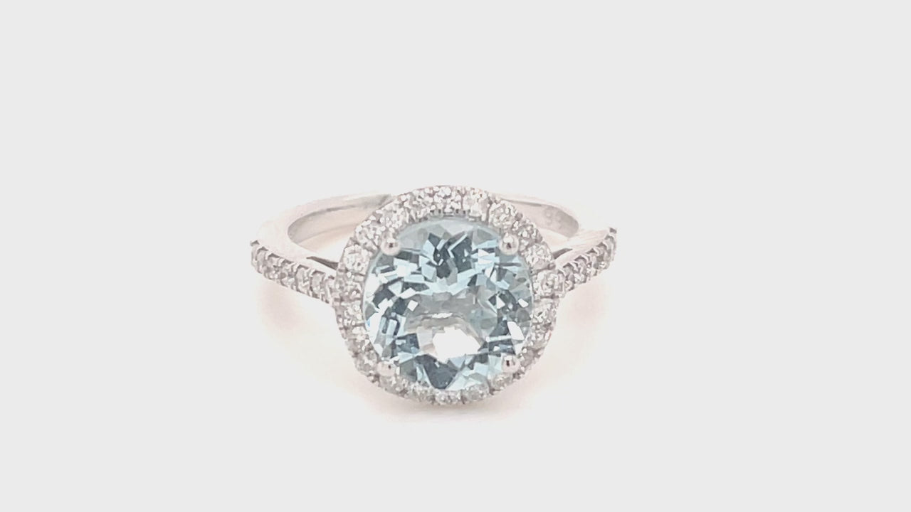 Show her how much you care with this lovely aquamarine and diamond ring! Crafted from beautiful white gold, this elegant and feminine ring features a dazzling central claw set, round aquamarine weighing 2.39ct, surrounded by round brilliant cut diamonds. The ring is handcrafted to perfection and is adorned with 0.43ct of natural, G/SI quality diamonds. The 18k white gold is hallmarked in the UK.