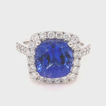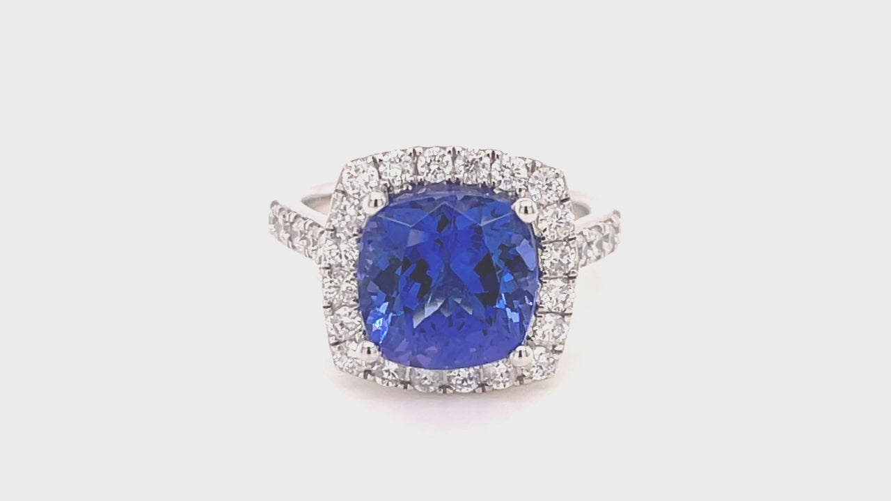 Halo Cushion Tanzanite 5.37ct and Diamond 1.00ct Ring in 18K White Gold