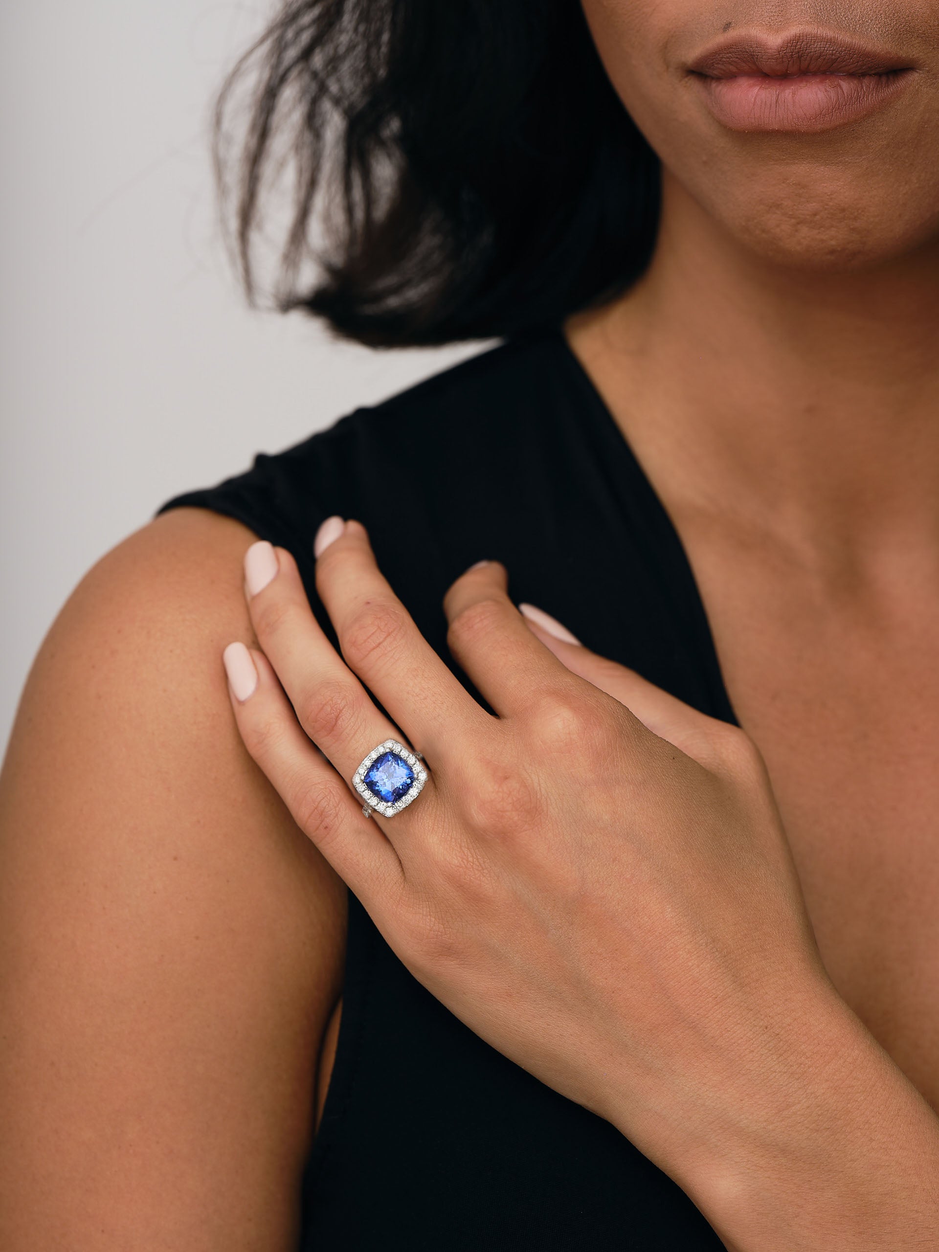 Halo Cushion Tanzanite 5.37ct and Diamond 1.00ct Ring in Platinum