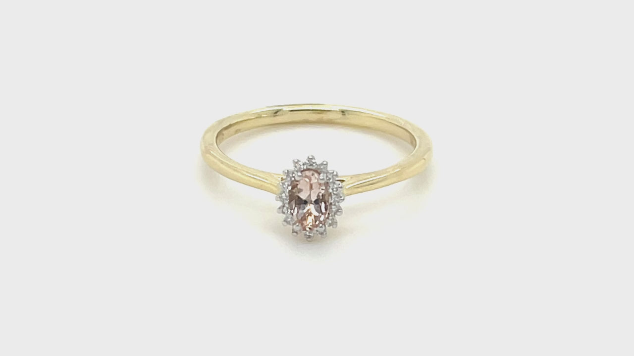 This halo ring, with its morganite centrepiece and its beautiful halo of diamonds, is suitable for every event and any wardrobe. The 0.25 carat, oval cut morganite is accentuated by 0.05 carats of G/SI quality diamonds set in a brilliant halo around the centre stone, bringing out the soft pink tones inside the stone. The 9 karat yellow gold that holds the beautiful stones has been hallmarked in the United Kingdom. This beautiful ring was made for you to enjoy!
