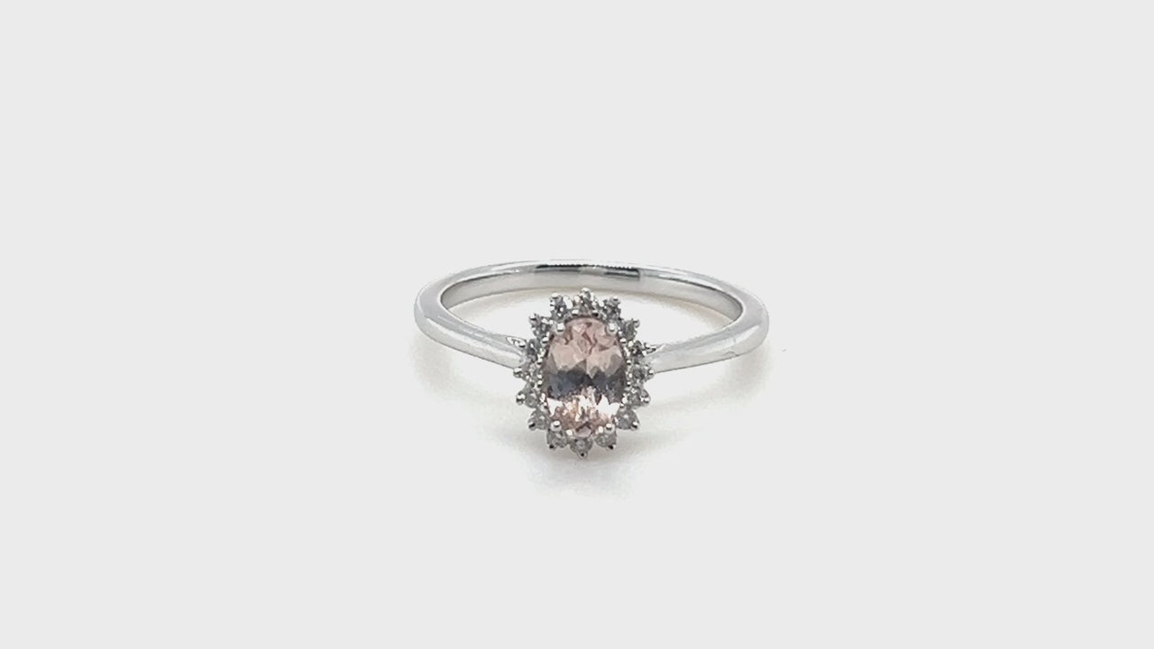 This ring, which features a centre morganite stone and a sparkling diamond halo side, is ideal for wearing with any clothing and on any occasion. The 0.40 carat, oval cut morganite is highlighted by a halo of 0.10 carats of G/SI quality diamonds that are set around the centre stone. The magnificent gemstones are mounted in UK hallmarked 9k white gold. Wearing this gorgeous ring will make you happy!