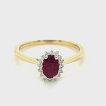 Our designers combined a blood-red ruby with brilliant white natural diamonds to create this magnificent ruby and diamond halo ring. The 9k yellow gold band is hallmarked in the UK. The ring has a 0.50 carat oval-cut red ruby. To highlight the centre stone, a halo of G/SI quality white diamond totalling 0.10 carats are used to create a sparkle to accentuate the ruby’s deep red. If you're feeling passionate or romantic, you should wear this ring.