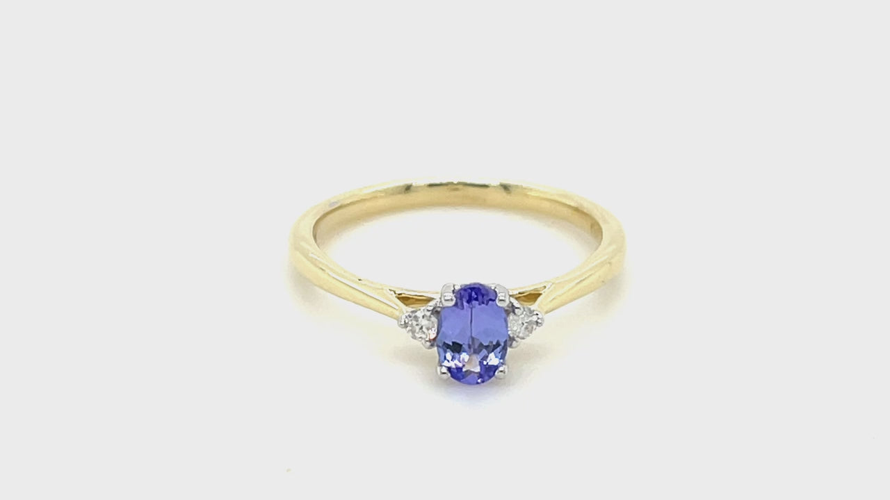 The December birthstone is tanzanite, a gorgeous gemstone with violet and blue tones. The oval-shaped tanzanite crystal that sits at the centre of this beautiful three stone tanzanite and diamond three stone ring weighs in at 0.50 carats. This stunning ring features a central tanzanite surrounded by two sparkling diamonds for more brilliance and glitter. The G/SI quality diamonds weigh a combined 0.06 carat and all the gemstones are mounted on a 9k yellow gold band.